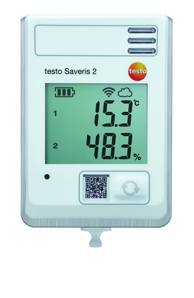The humidity and temperature monitoring system consists of at least one WiFi data logger and a Cloud access (online data store). As a component of this data logger system, the testo Saveris 2-H1 temperature and humidity data logger with integrated temperature and humidity probes stores all measured values and transmits them directly by wireless LAN to the Testo Cloud. You can use the alarm function to receive immediate warnings by e-mail or SMS (optional) when limit values are violated.